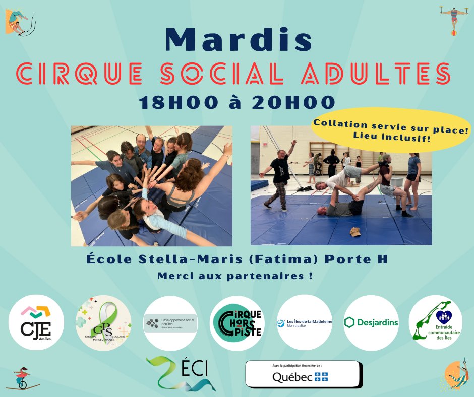 Aucune expérience requise : venez comme vous êtes, pour rire, bouger et rencontrer du monde. Une intervenante du Carrefour jeunesse-emploi des Îles est aussi présente pour offrir écoute et accompagnement à celleux qui le souhaitent.